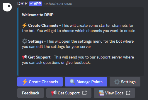 channel and is used to make changes to Drip Rewards in your community. You can also access the Drip Support Discord and Documentation via the dashboard. Click on the various buttons in the embed to use the dashboard: