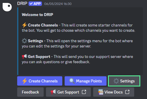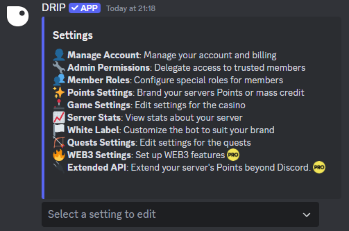 Drip Rewards has many settings to play with, all can used without having to leave Discord. Here is a small overview of the many features.✨ Points Settings