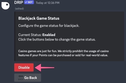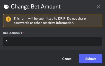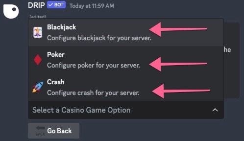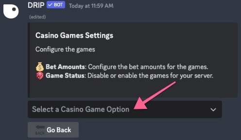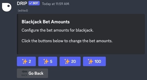 After choosing the game you would like to edit, a new embed will appear with the current bet amounts for the selected game.