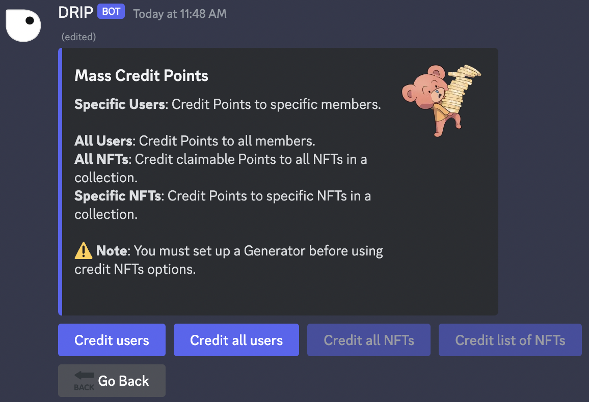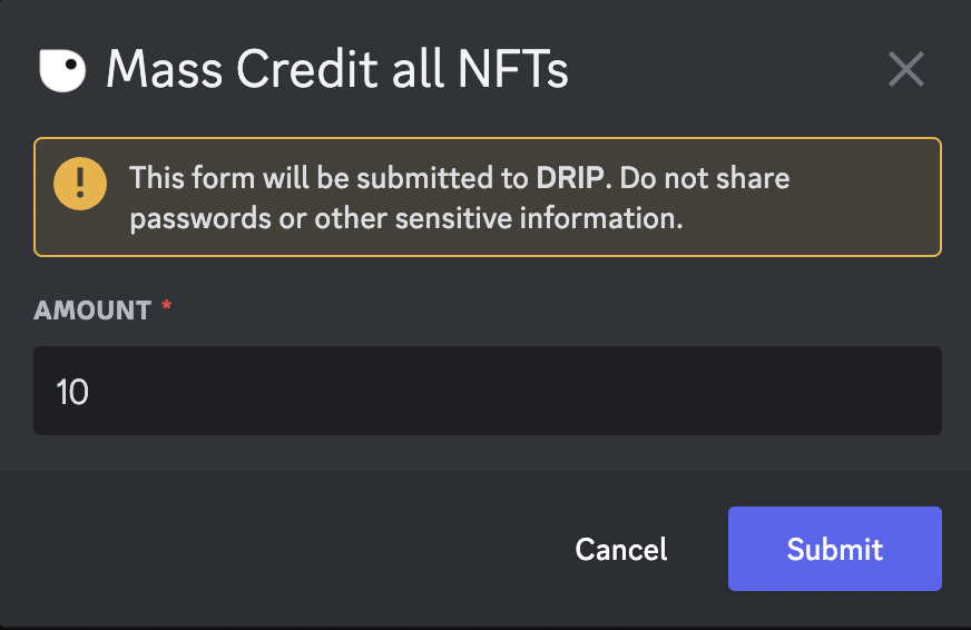 To credit all NFTs, use theCredit all NFTs button. Once you have clicked the button, you will be presented with a form where you must enter the number of points you want to award to all NFTs. Once you click Submit, it will credit the Points.