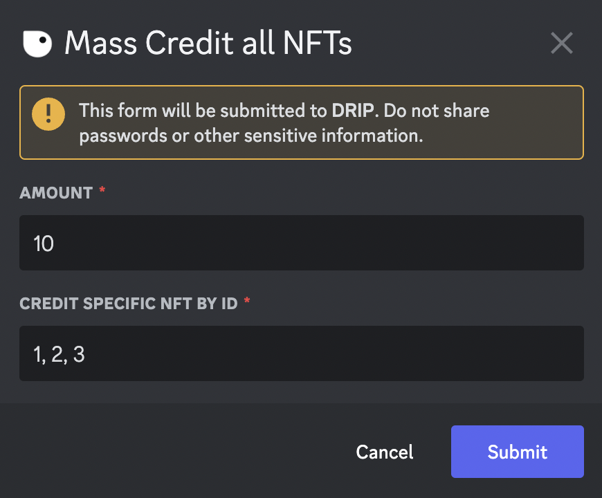 To credit specific NFTs, use theCredit list of NFTs button. Once you have clicked on the button, you will get a form where you have to enter the number of points you want to credit and all the ids of the NFTs, separated by a comma.