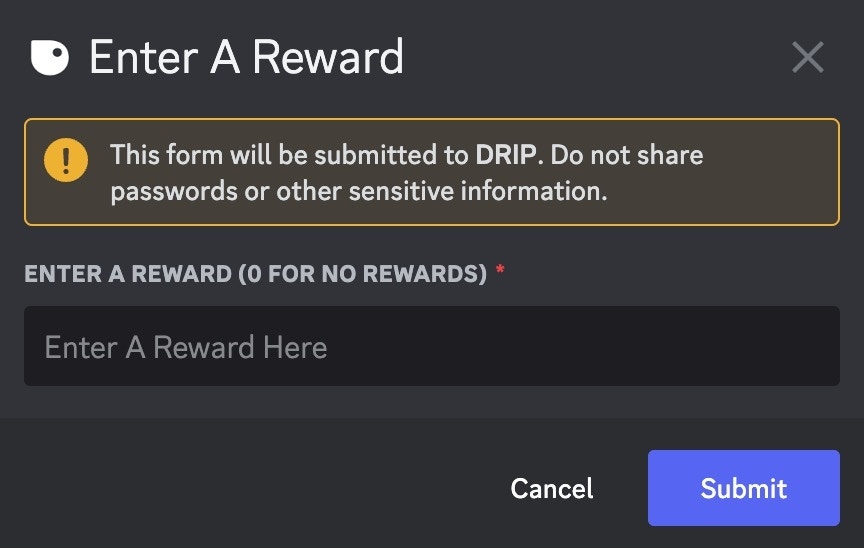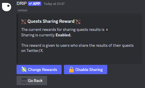 💸 Change Rewards button to change the amount of points given to a user when they share a quest reward on Twitter. A form will appear for you to enter a reward, enter “0” for no rewards or click 🔒``Disable Sharing.