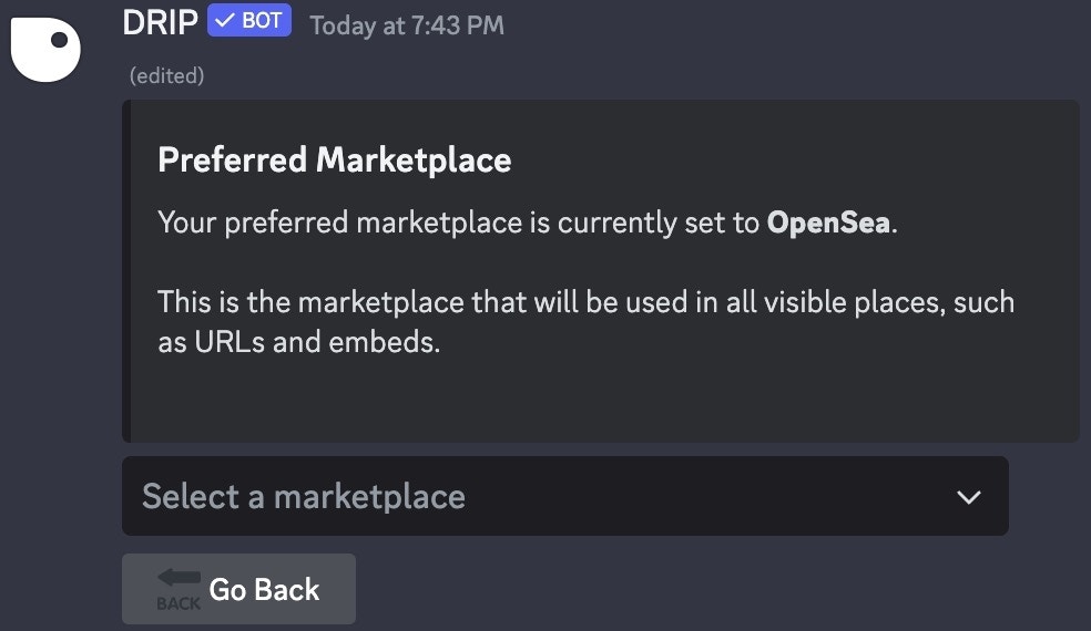 🛒 Preferred Marketplace ****from the dropdown menu in Web3 Settings, a new embed will appear: