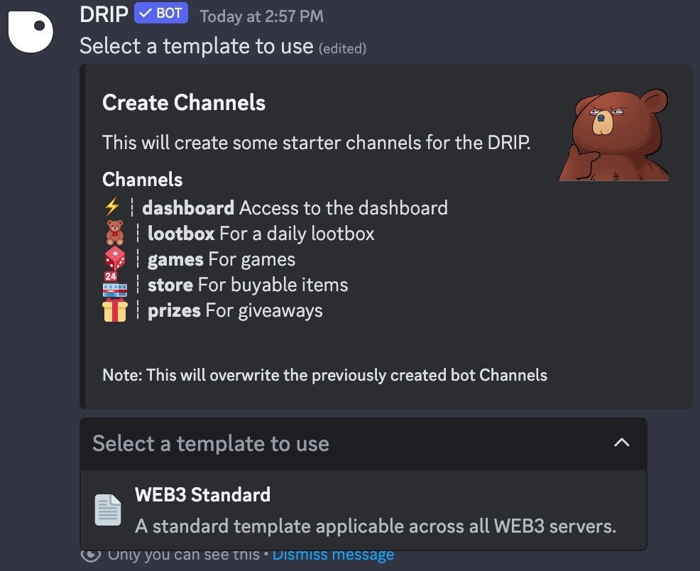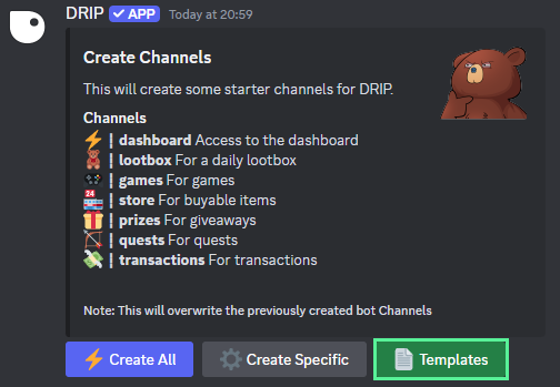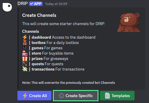 - ⚡️ Create All: Create all of the basic channels that come with the Drip Rewards template (dashboard, lootbox, games, store, and prizes)