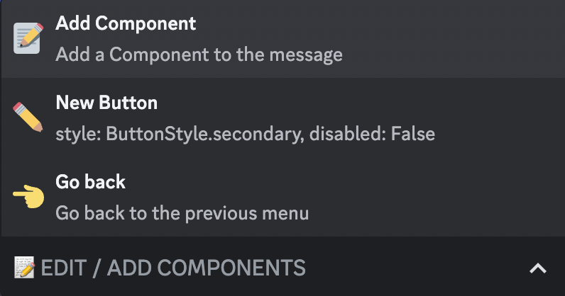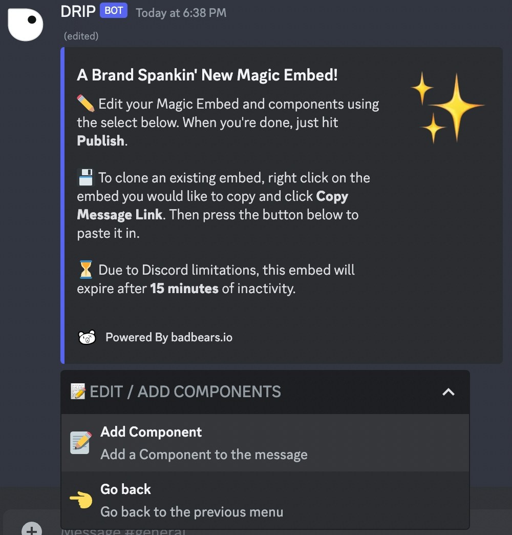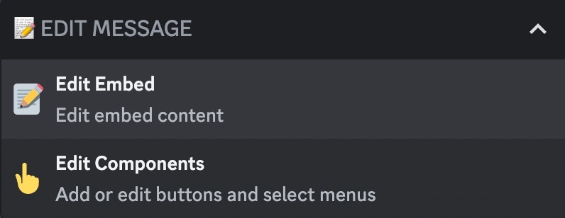 To edit the embed components, use the command/create type:✨ Magic Embed and select the 👆 Edit Components option.