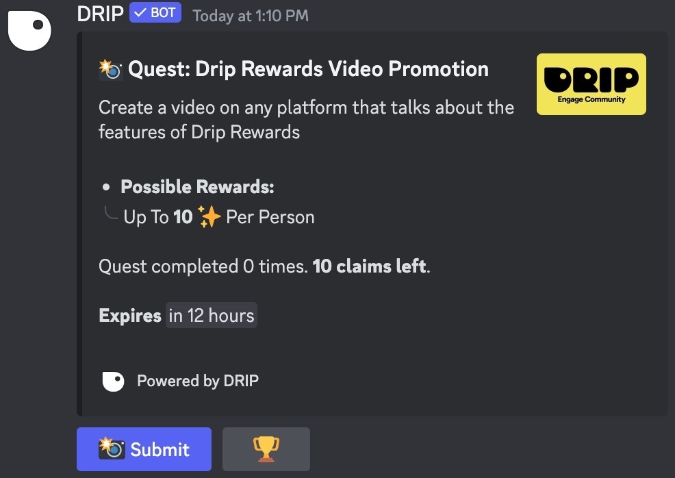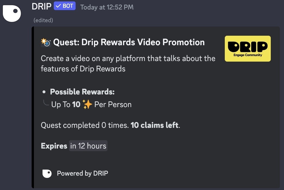 - ✨ Rewards: Modify the total budget and amount of points per claim. You can also select a role to reward upon completion of the quest