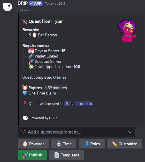 - ⏱ Time: Change the expiry limit of the Quest (leave blank for no expiry)