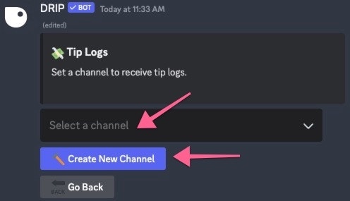 Then select which channel you would like tips to be sent in from the dropdown menu or have Drip create one for you!