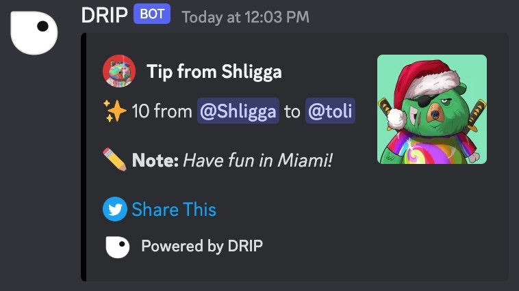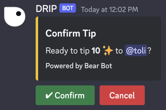 ✔️ Confirm button to confirm and send your tip. Now your tip will appear in the channel: