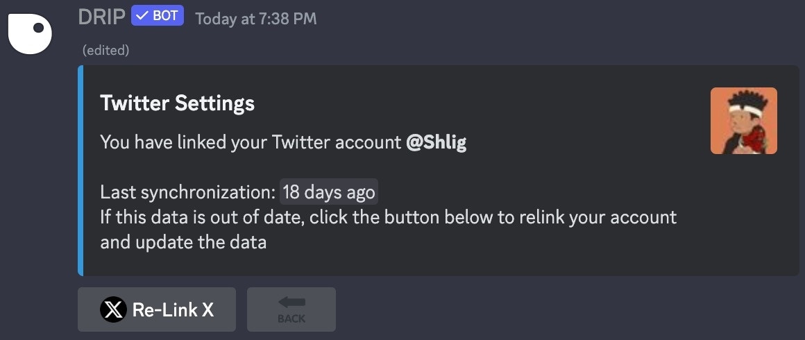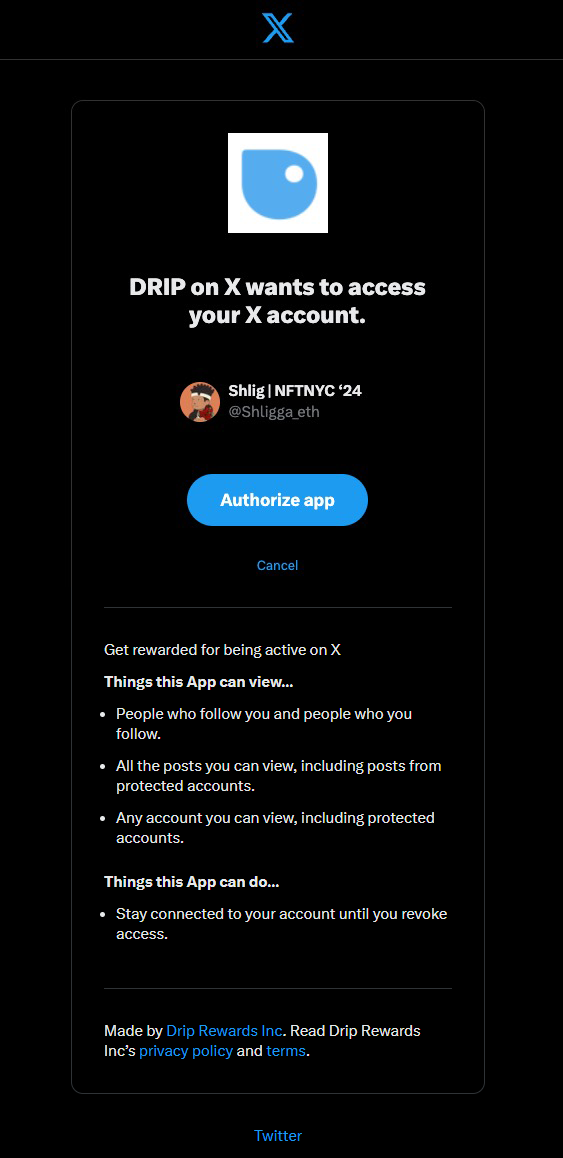 Authorize App ****to link your X Account to Drip Rewards/ For more information about permissions. required, you can read our FAQ. Your Twitter Settings Menu will now appear something like this: